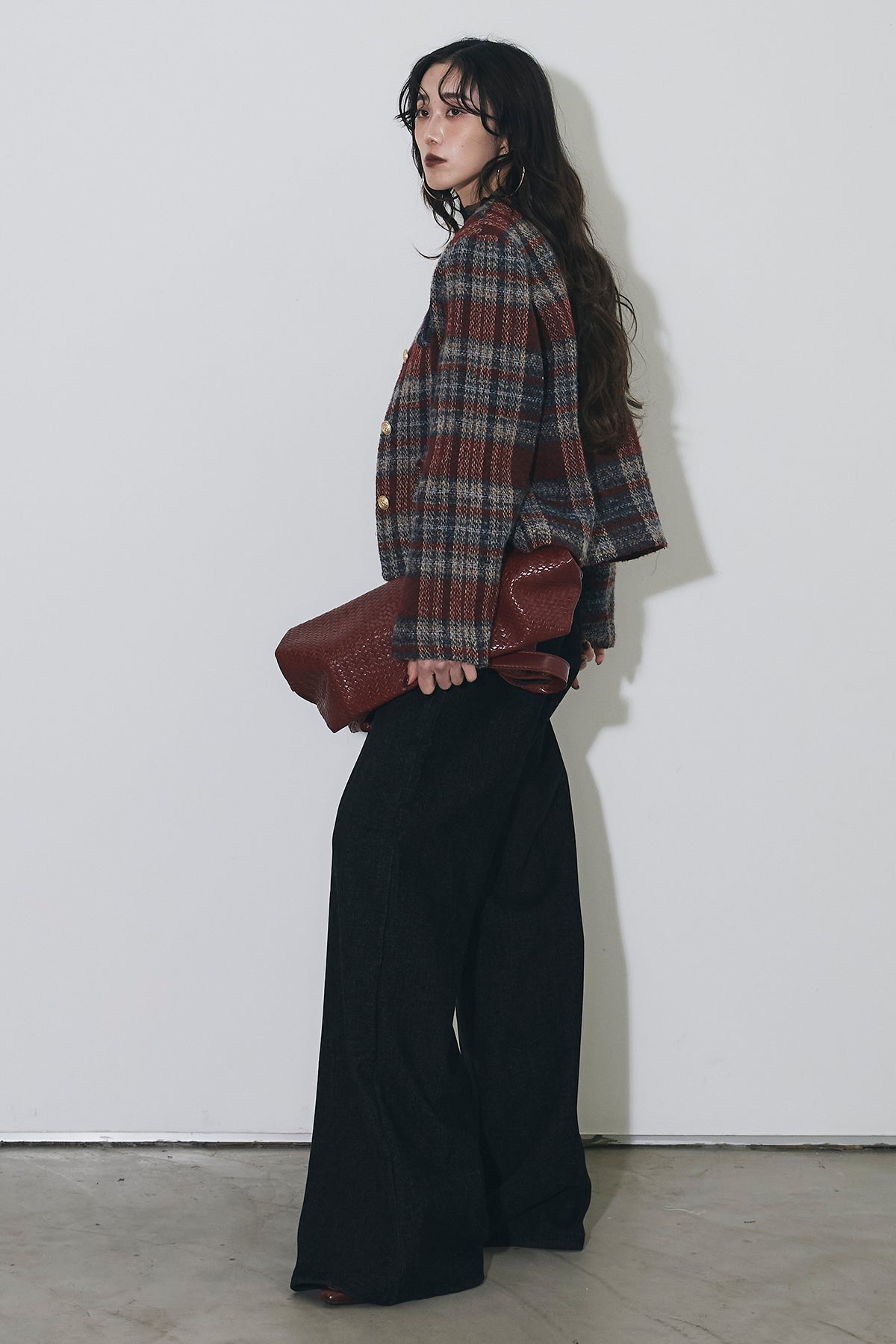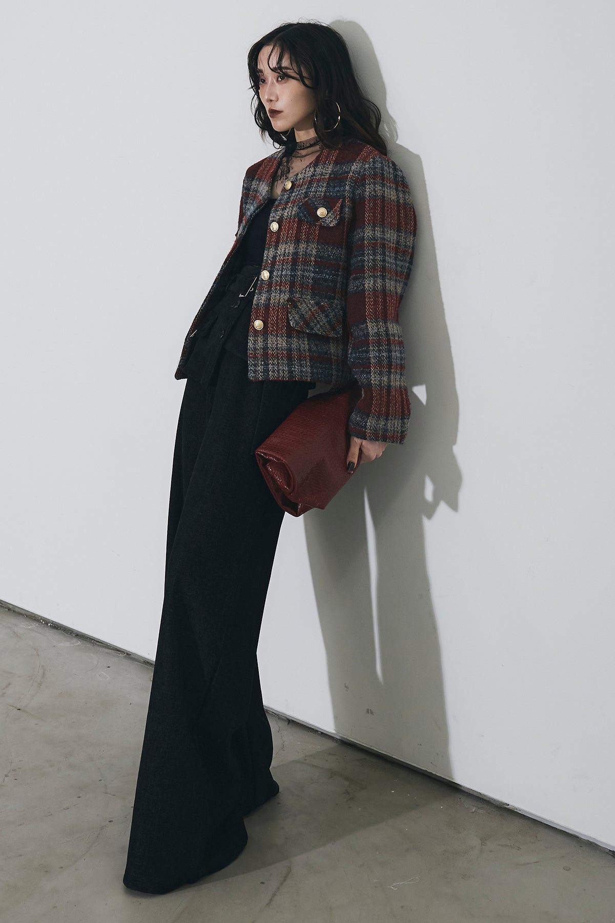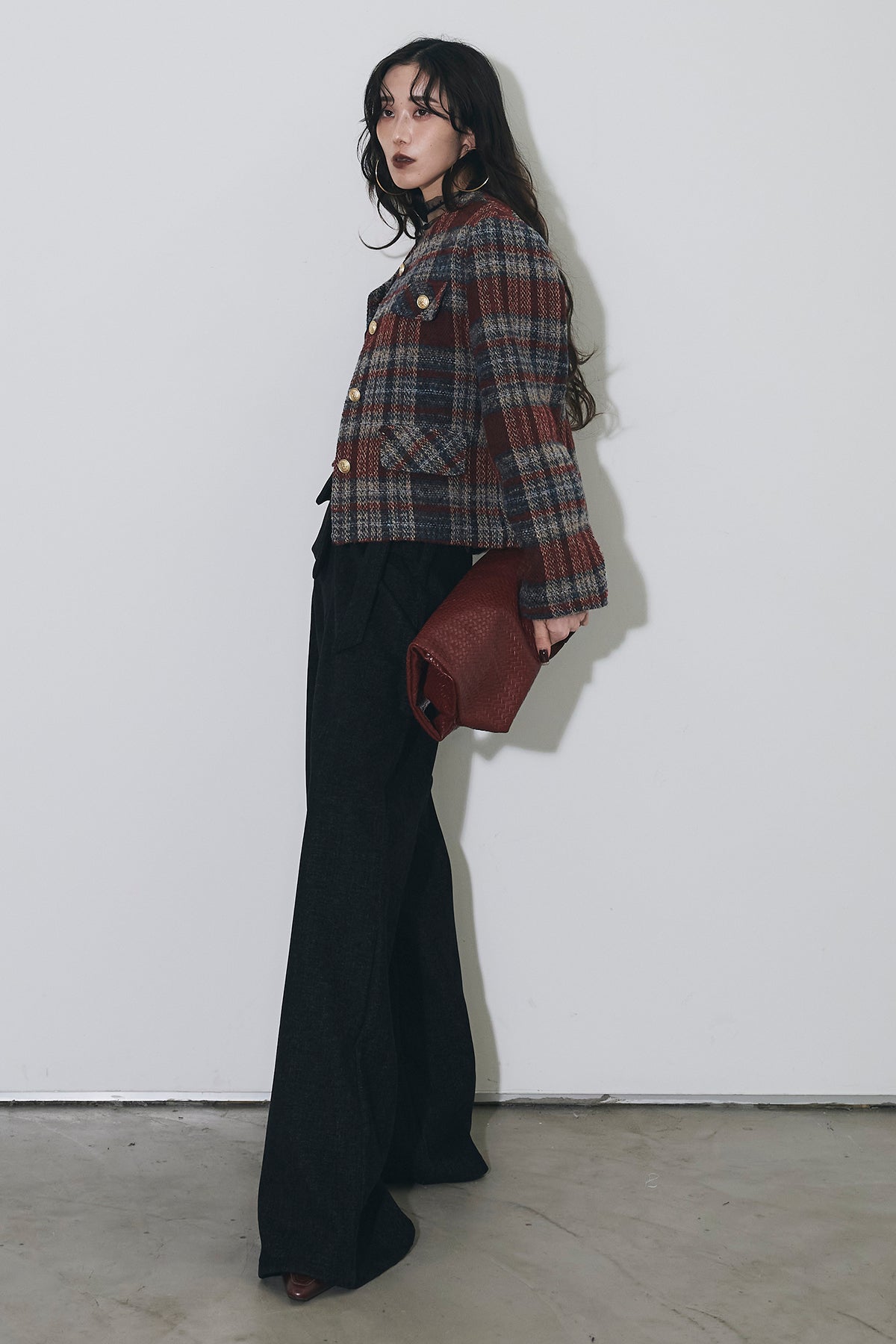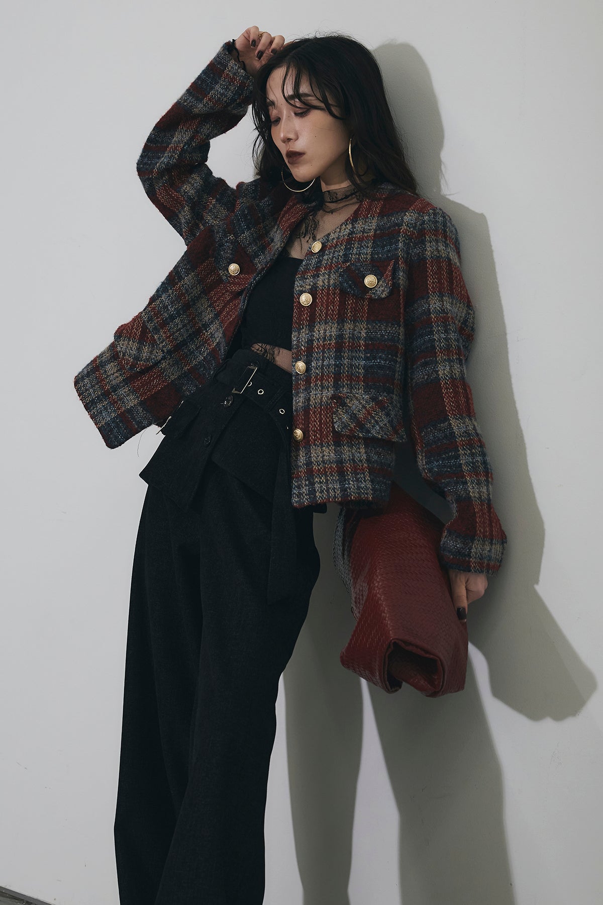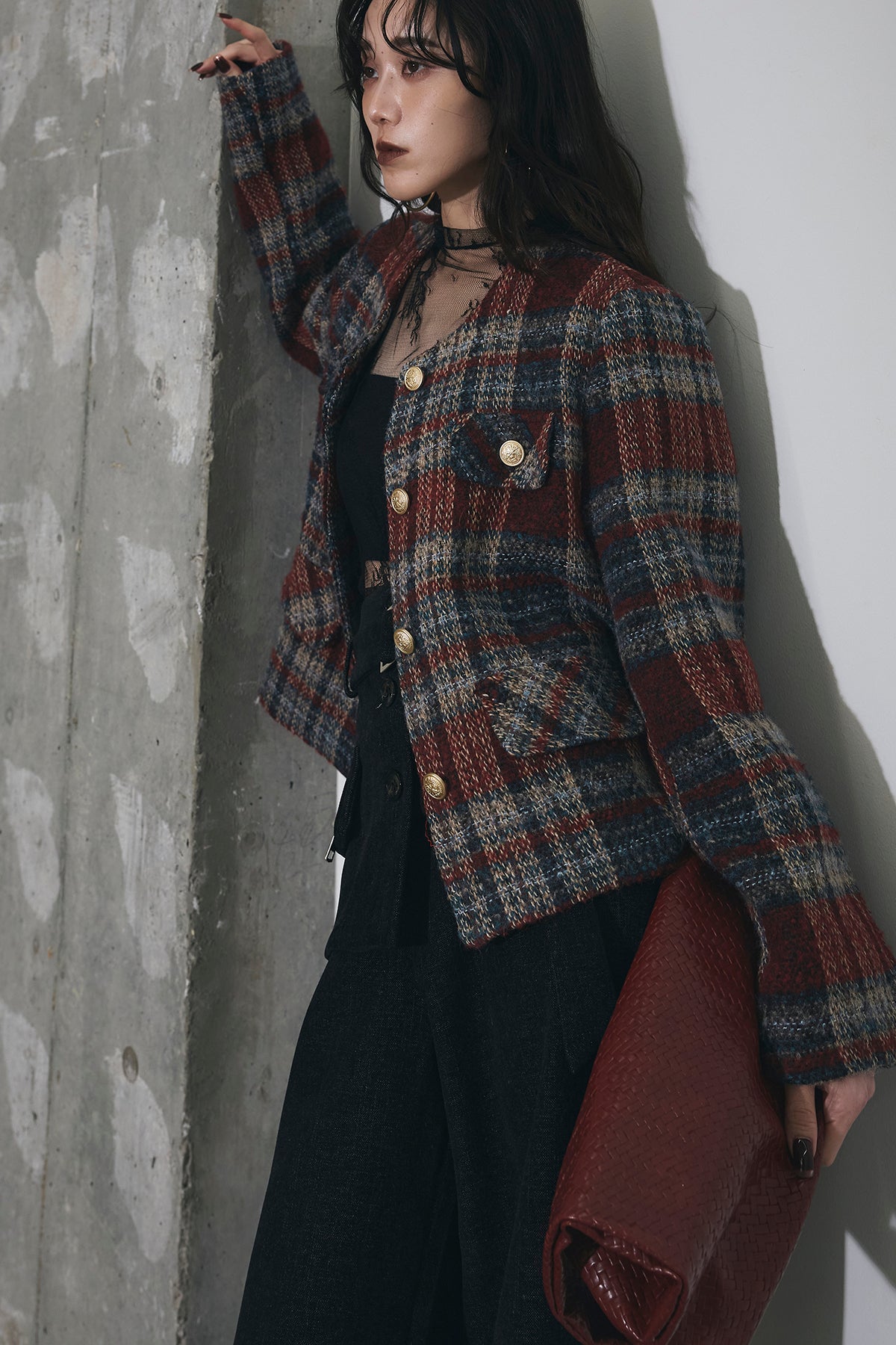 深みのあるカラーリングが印象的なチェックツイードジャケット。 しっかりとした厚みのある生地でシーズンムードを高め、 ゴールドボタンが上品なアクセントに。 ややショート丈のバランスがスタイルアップを叶え、 デニムからワイドパンツまで幅広くマッチします。 シンプルなインナーを合わせるだけで洗練されたクラシックスタイルに。