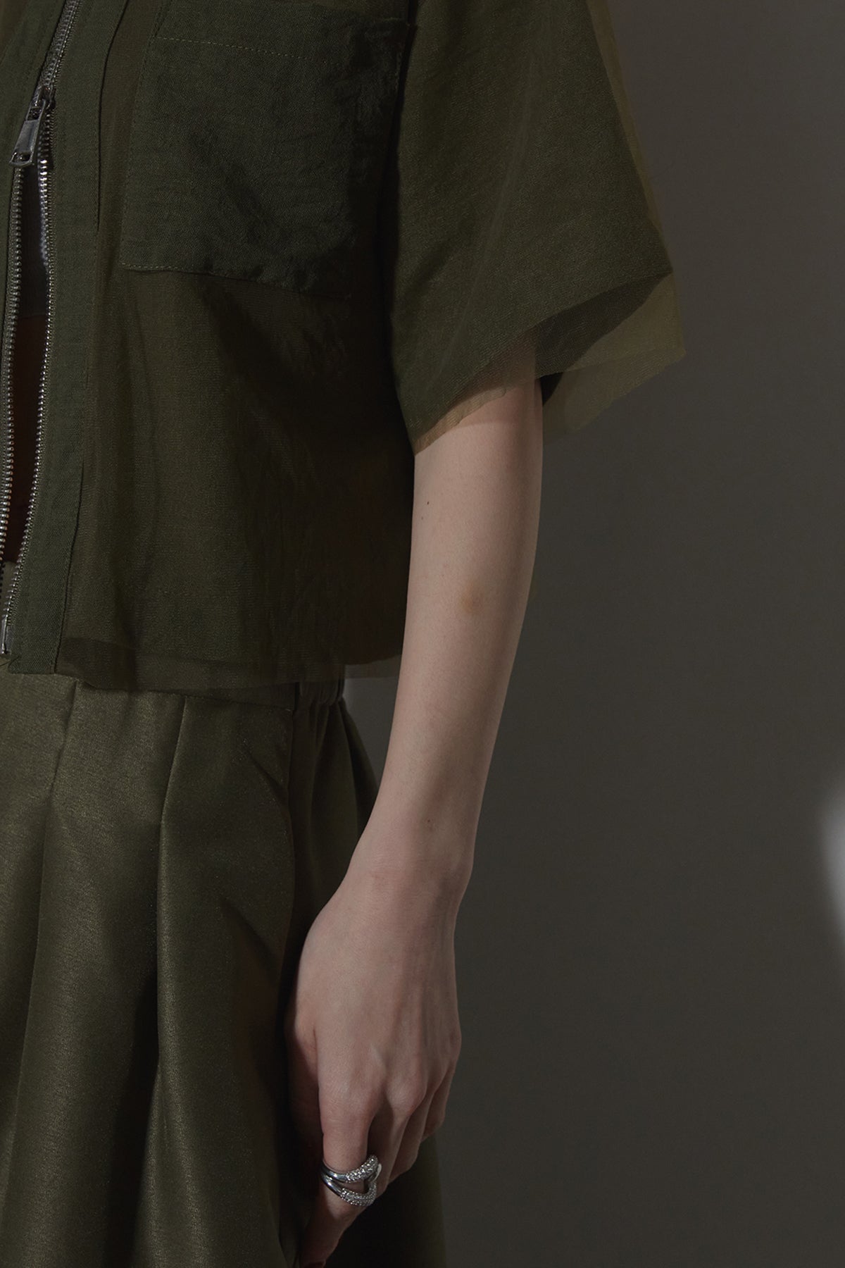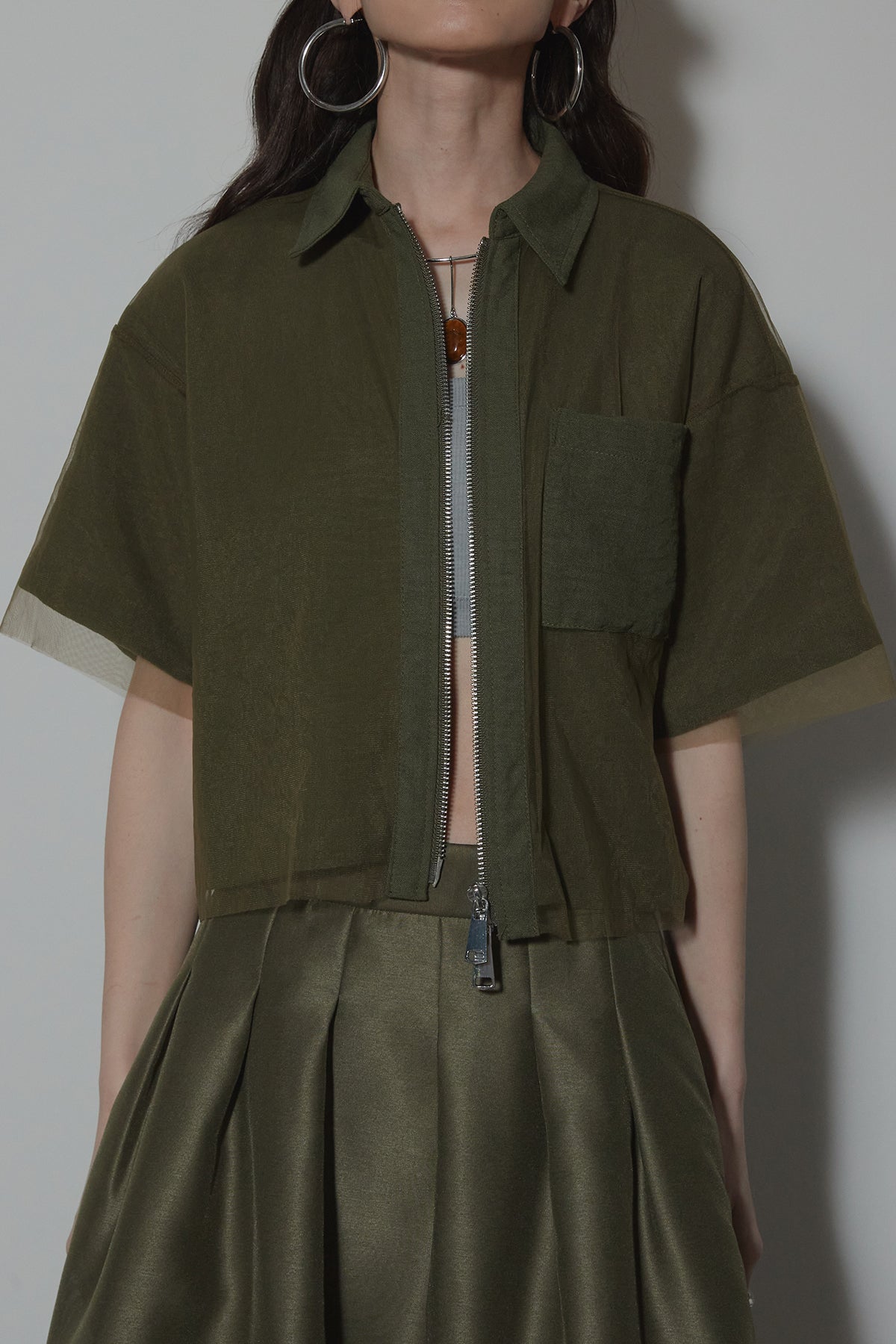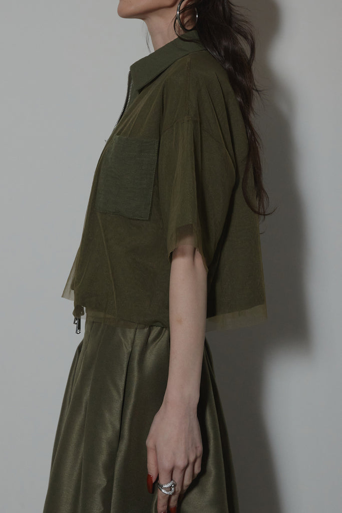 チュール素材を重ねた異素材ミックスのショートトップス。 フロントのダブルジップがスタイリングにアクセントをプラス。 軽やかでモードな印象を与える一枚です。