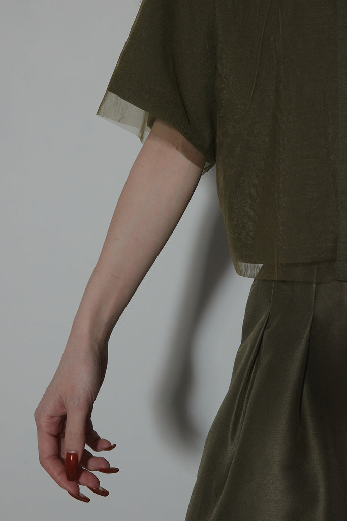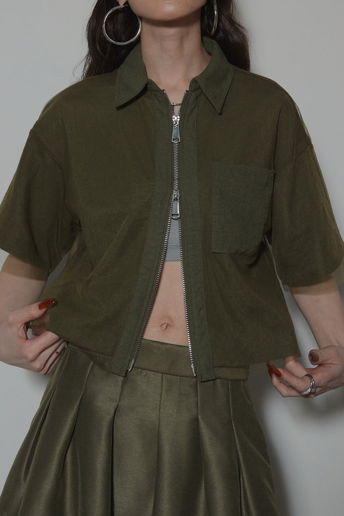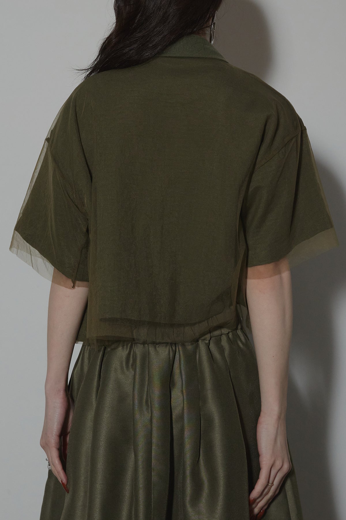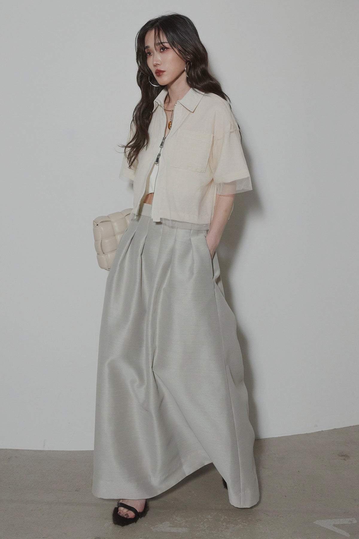 チュール素材を重ねた異素材ミックスのショートトップス。 フロントのダブルジップがスタイリングにアクセントをプラス。 軽やかでモードな印象を与える一枚です。