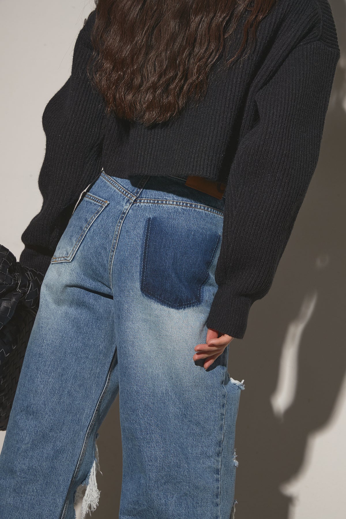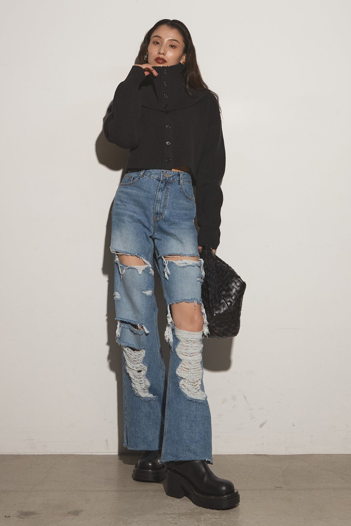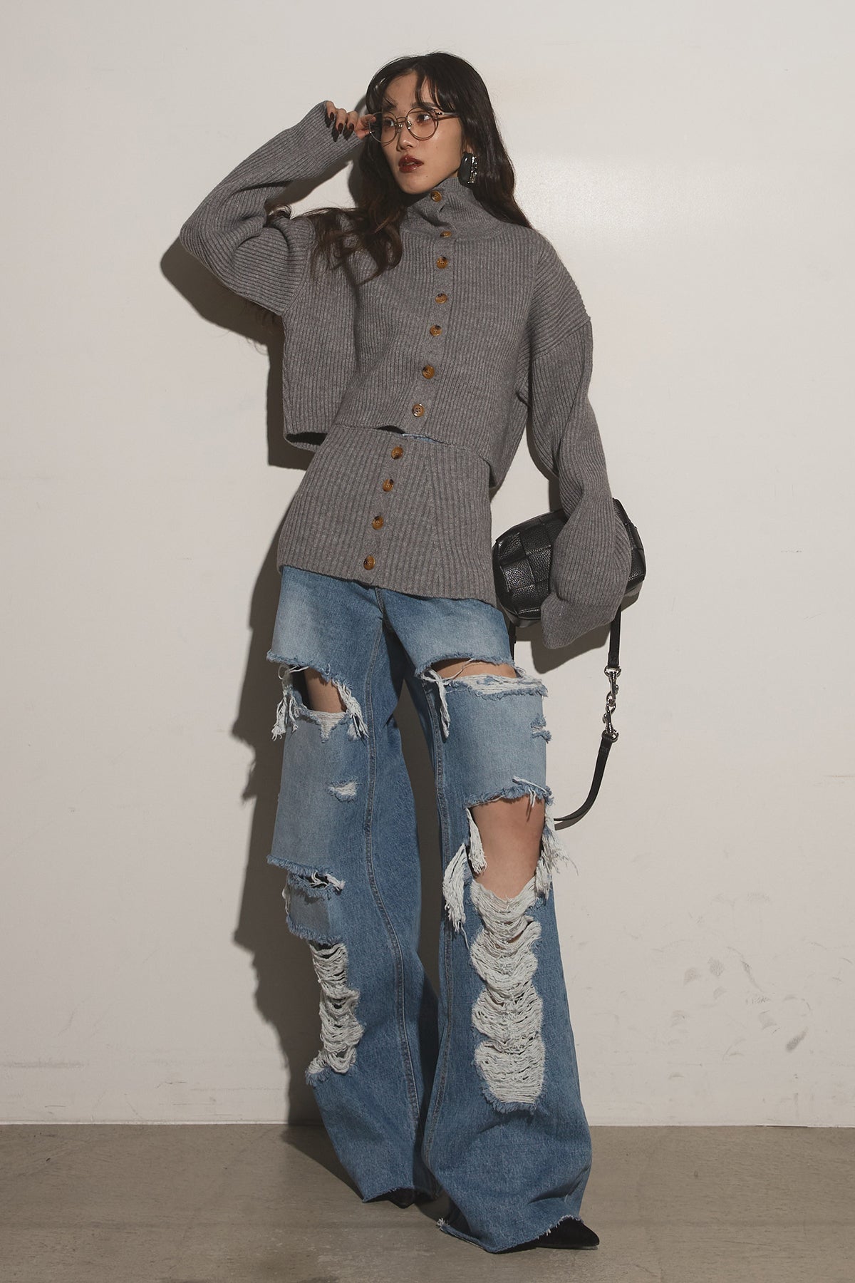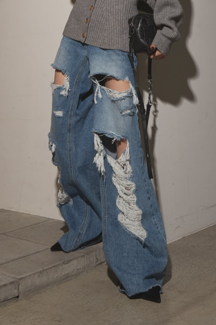 ご注文前に必ずページ下部「お届け期間」をご確認くださいませ。大胆なクラッシュ加工が目を惹くデニムパンツ。ハイウエスト×ワイドシルエットで脚長見えしつつ、存在感のあるスタイリングが完成します。裾はラフなカットオフ仕様でこなれ感もプラス。