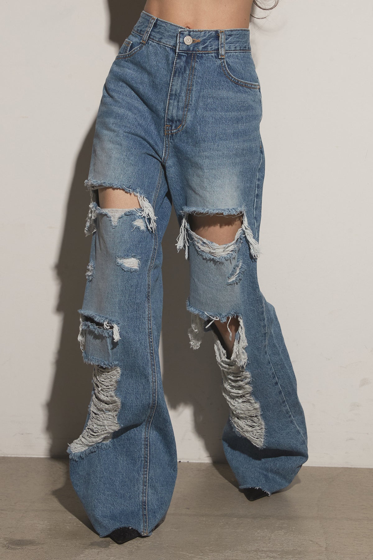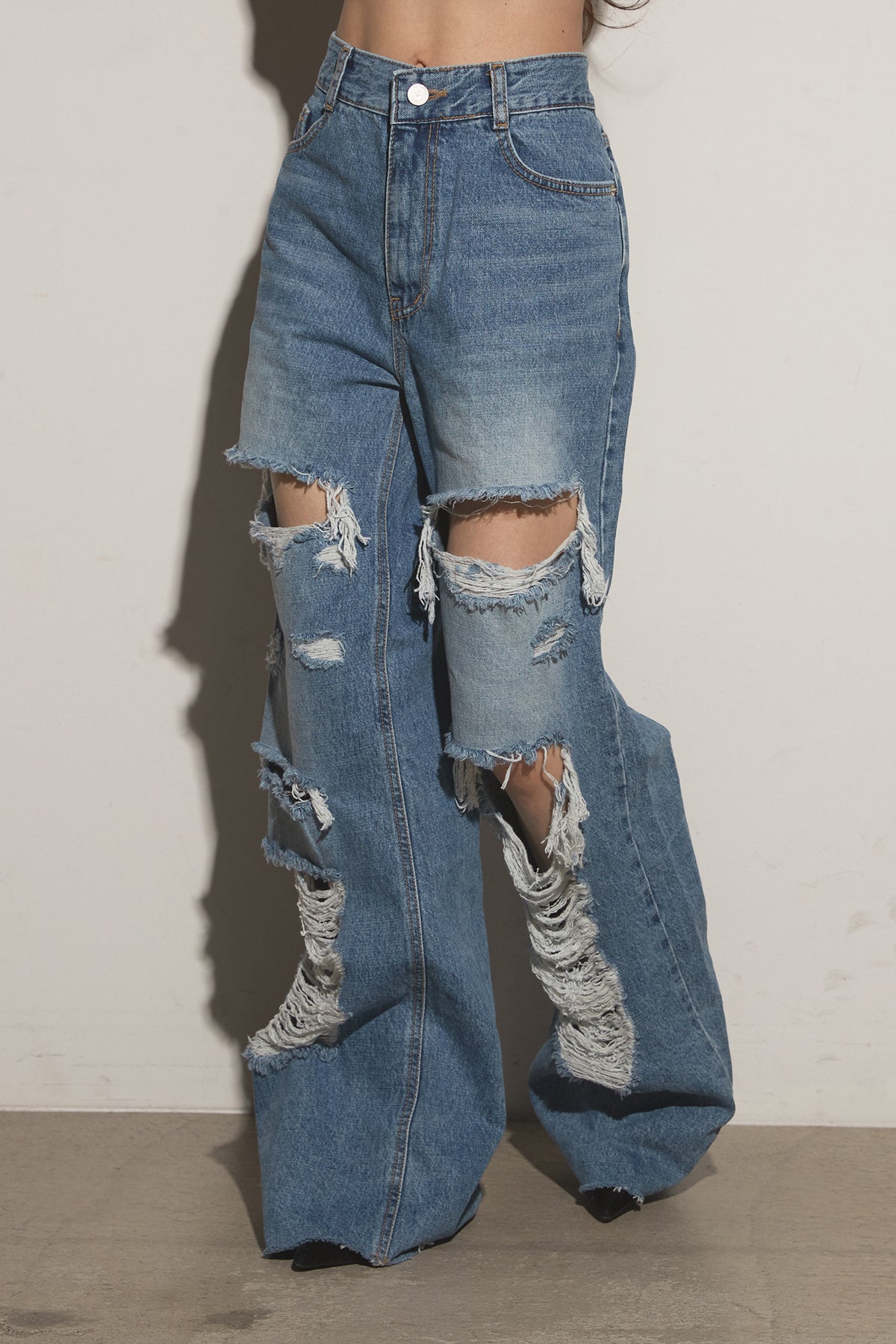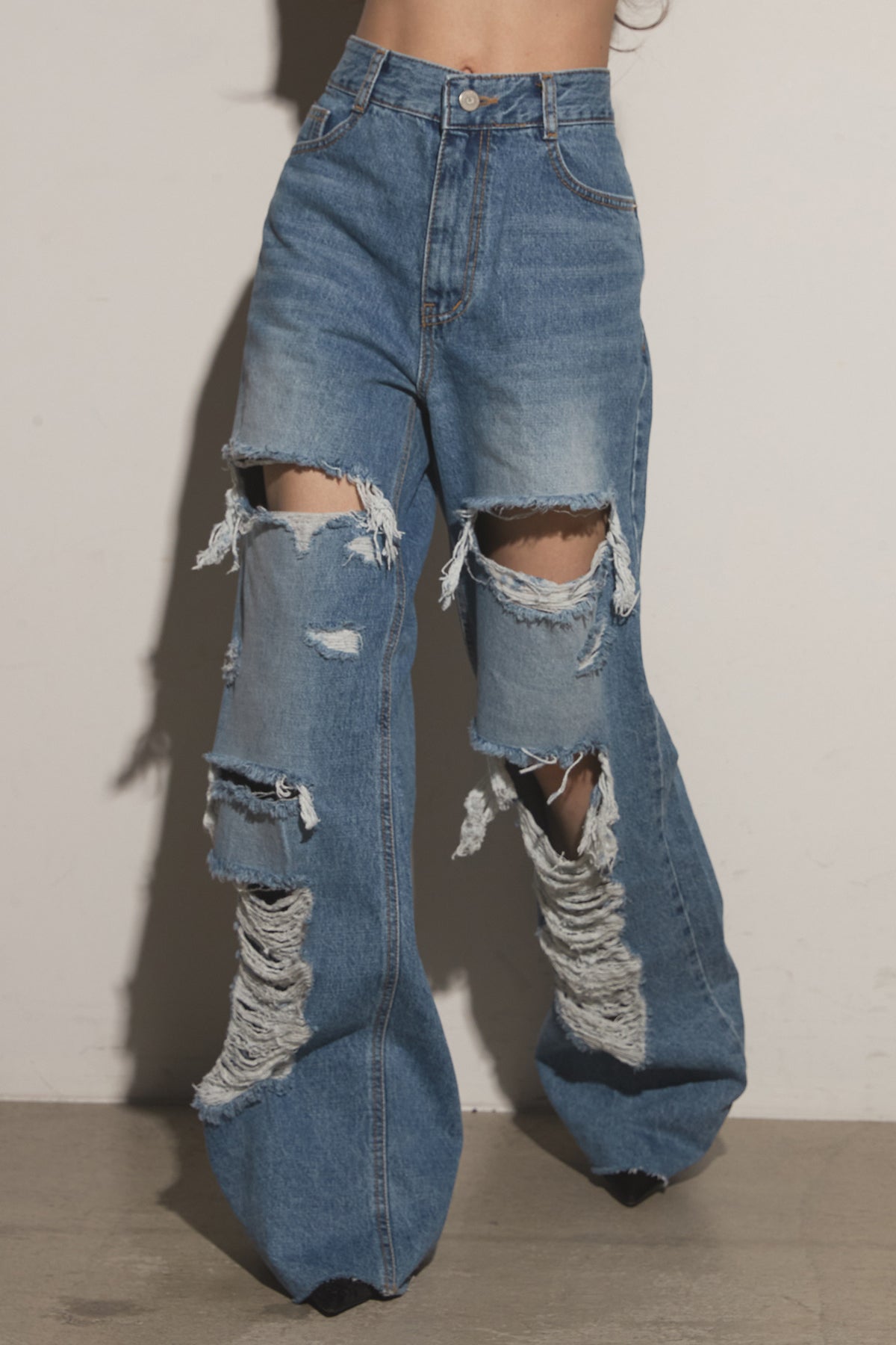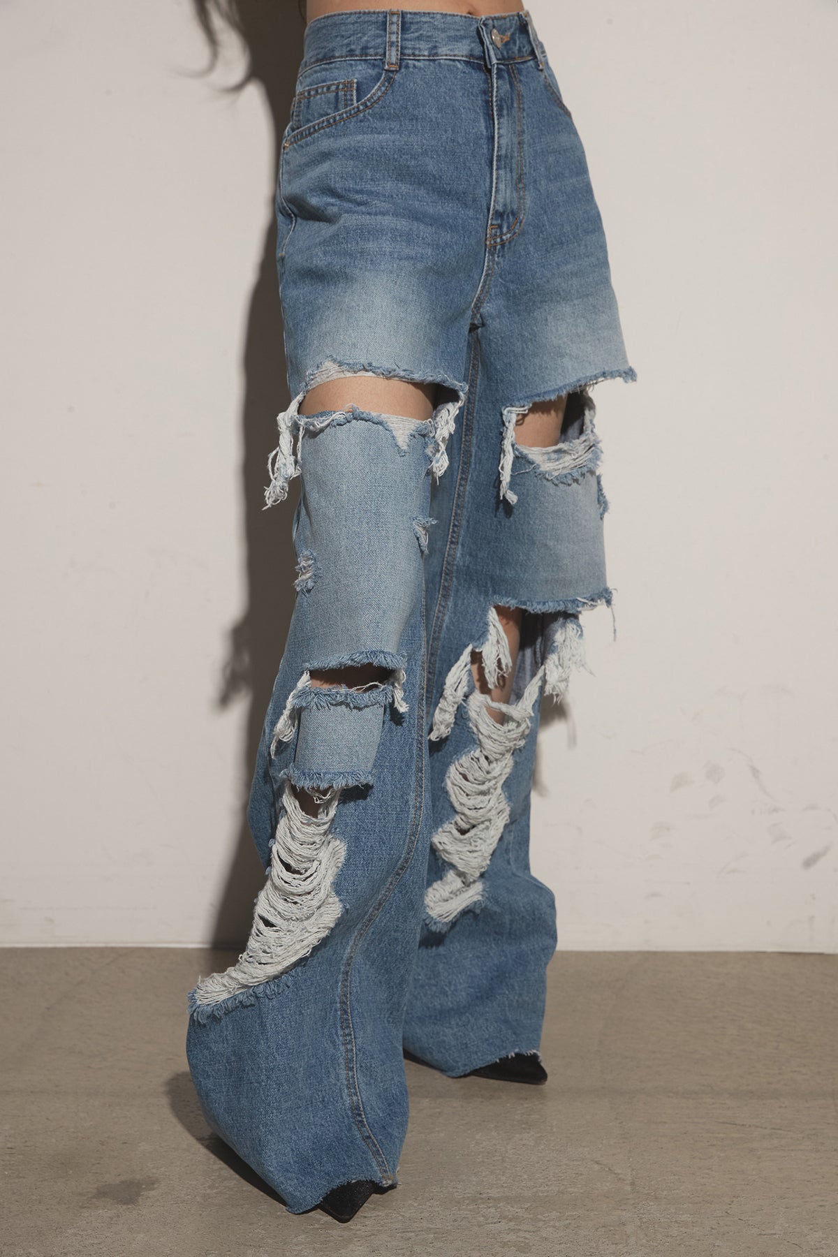 ご注文前に必ずページ下部「お届け期間」をご確認くださいませ。大胆なクラッシュ加工が目を惹くデニムパンツ。ハイウエスト×ワイドシルエットで脚長見えしつつ、存在感のあるスタイリングが完成します。裾はラフなカットオフ仕様でこなれ感もプラス。