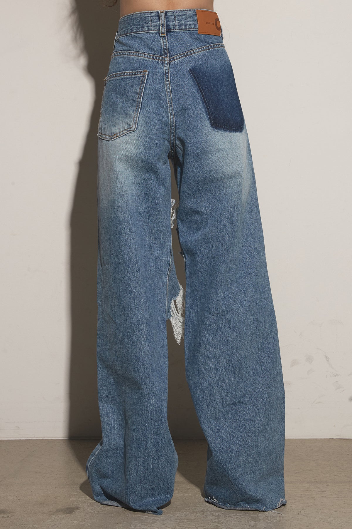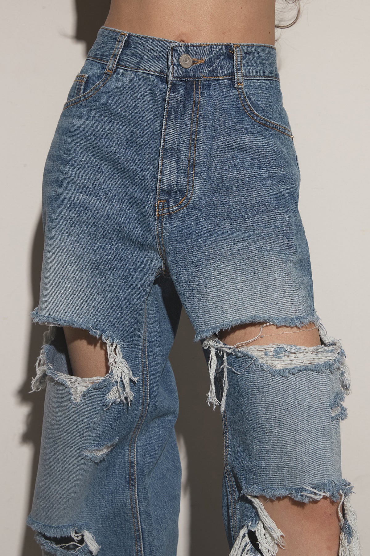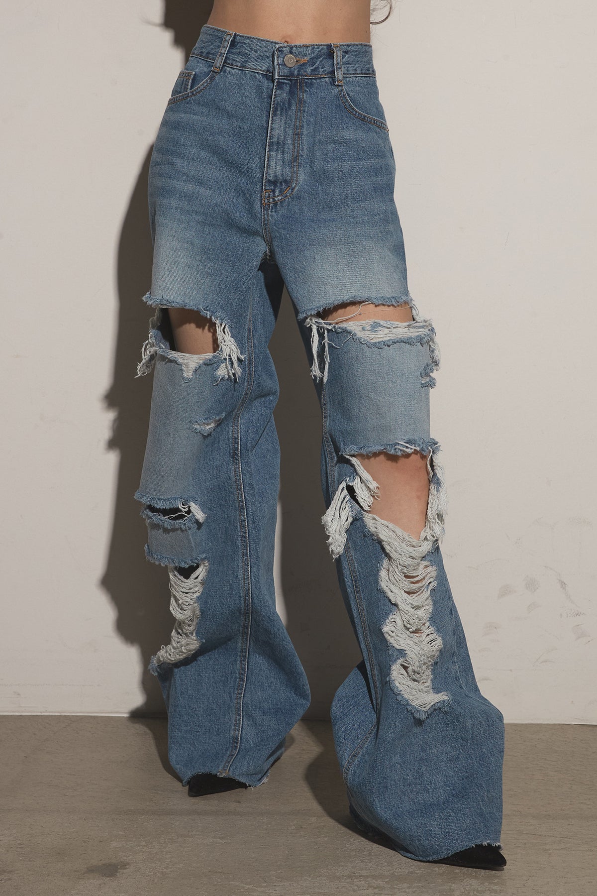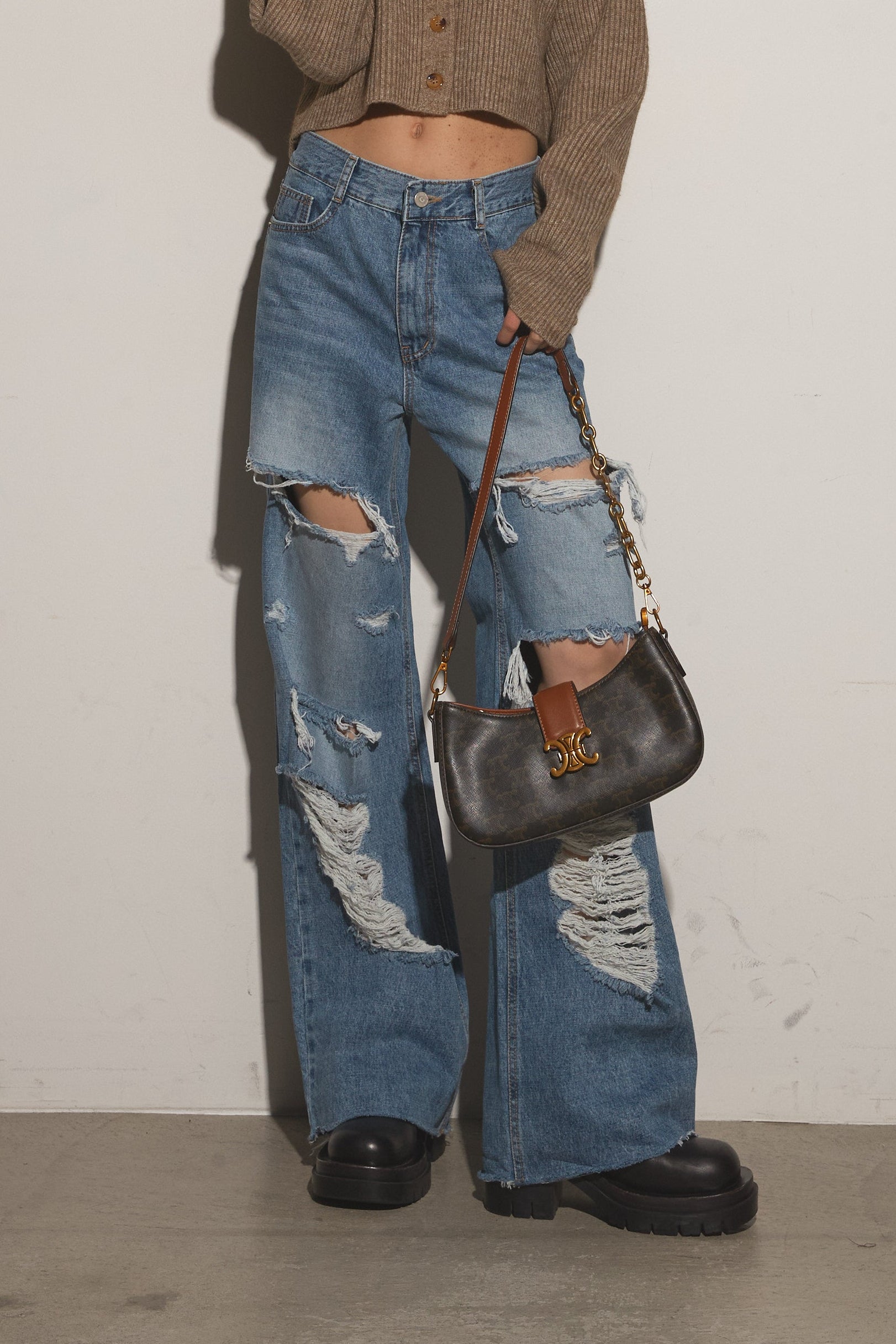 ご注文前に必ずページ下部「お届け期間」をご確認くださいませ。大胆なクラッシュ加工が目を惹くデニムパンツ。ハイウエスト×ワイドシルエットで脚長見えしつつ、存在感のあるスタイリングが完成します。裾はラフなカットオフ仕様でこなれ感もプラス。