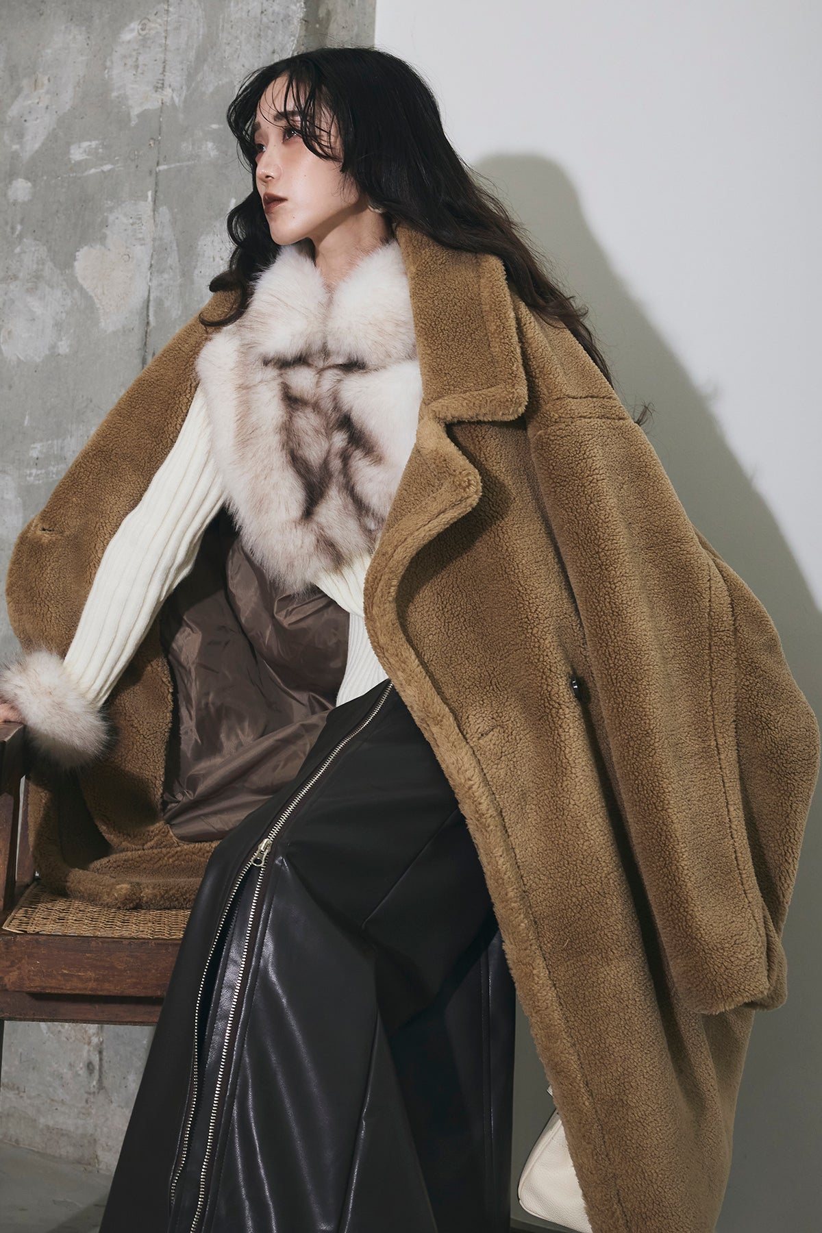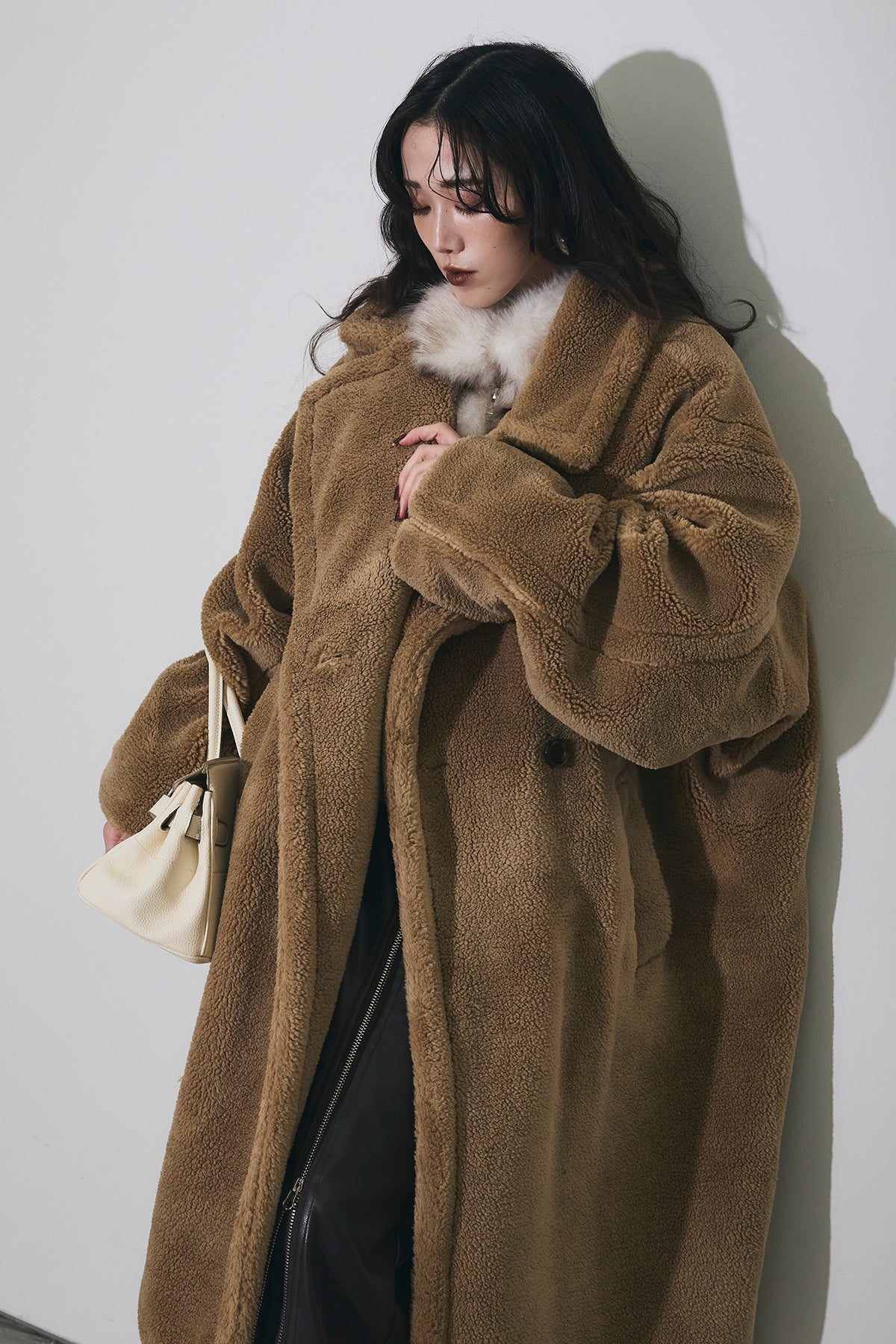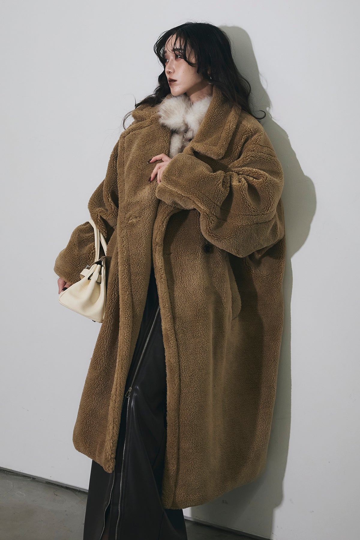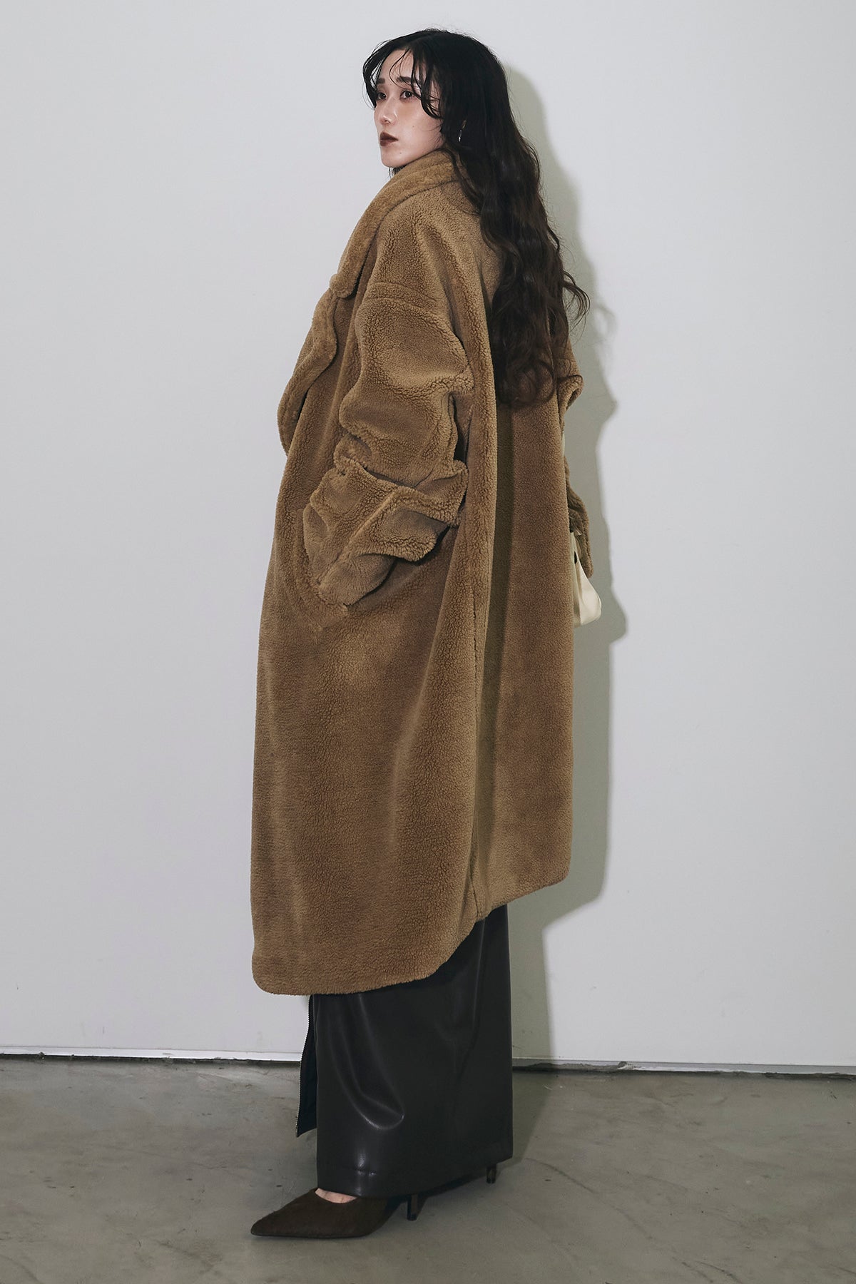 ご注文前に必ずページ下部「お届け期間」をご確認くださいませ。ふっくらとした質感が魅力のムートン調ファー素材を使用したオーバーサイズコート。 ゆったりとしたシルエットながらも、ドロップショルダーと長めの着丈で抜け感を演出。 大きめのラペルとやわらかな毛足が、冬のスタイリングにラグジュアリーな印象をプラスします。 軽やかな着心地でありながら、しっかりと防寒性も備えた一枚。 カジュアルにもモードにも映える万能アウターです。