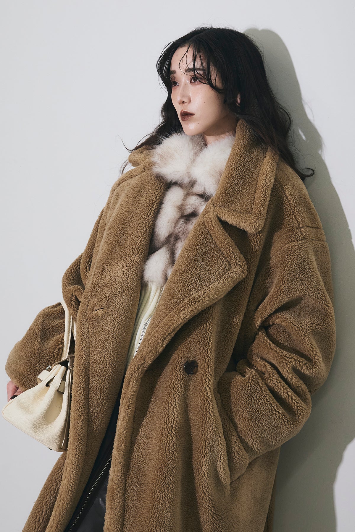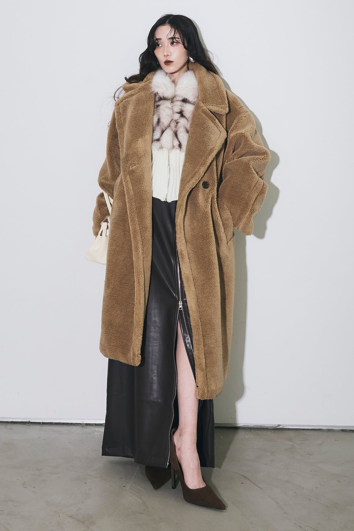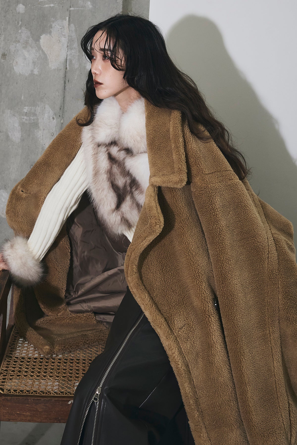 ご注文前に必ずページ下部「お届け期間」をご確認くださいませ。ふっくらとした質感が魅力のムートン調ファー素材を使用したオーバーサイズコート。 ゆったりとしたシルエットながらも、ドロップショルダーと長めの着丈で抜け感を演出。 大きめのラペルとやわらかな毛足が、冬のスタイリングにラグジュアリーな印象をプラスします。 軽やかな着心地でありながら、しっかりと防寒性も備えた一枚。 カジュアルにもモードにも映える万能アウターです。