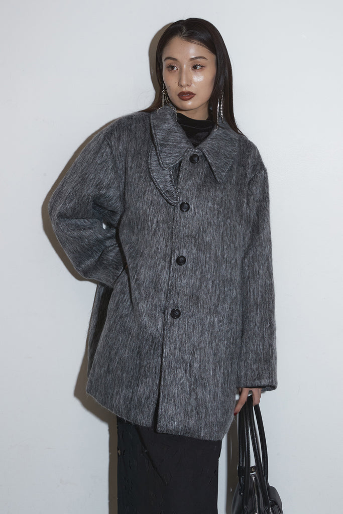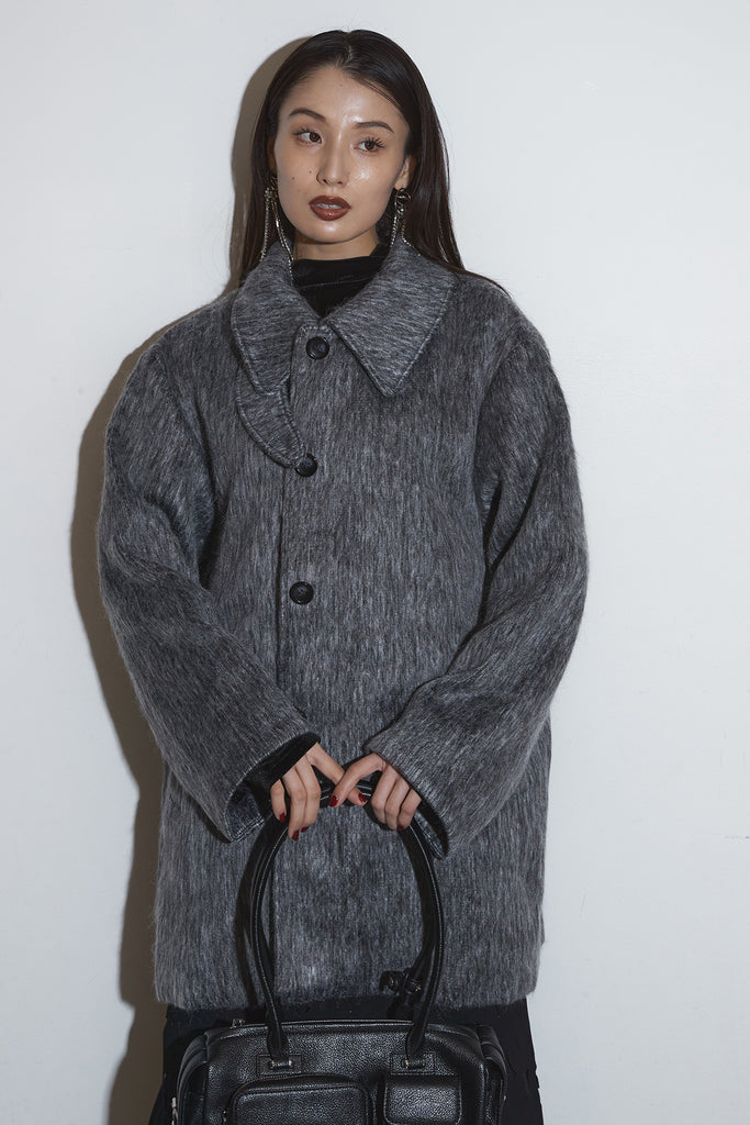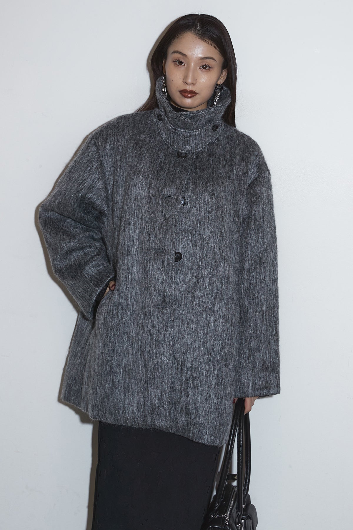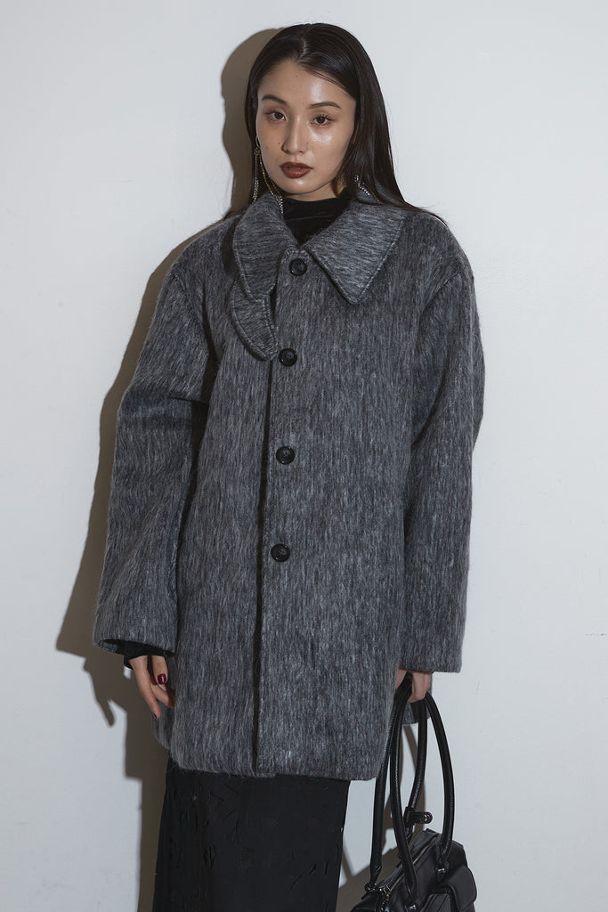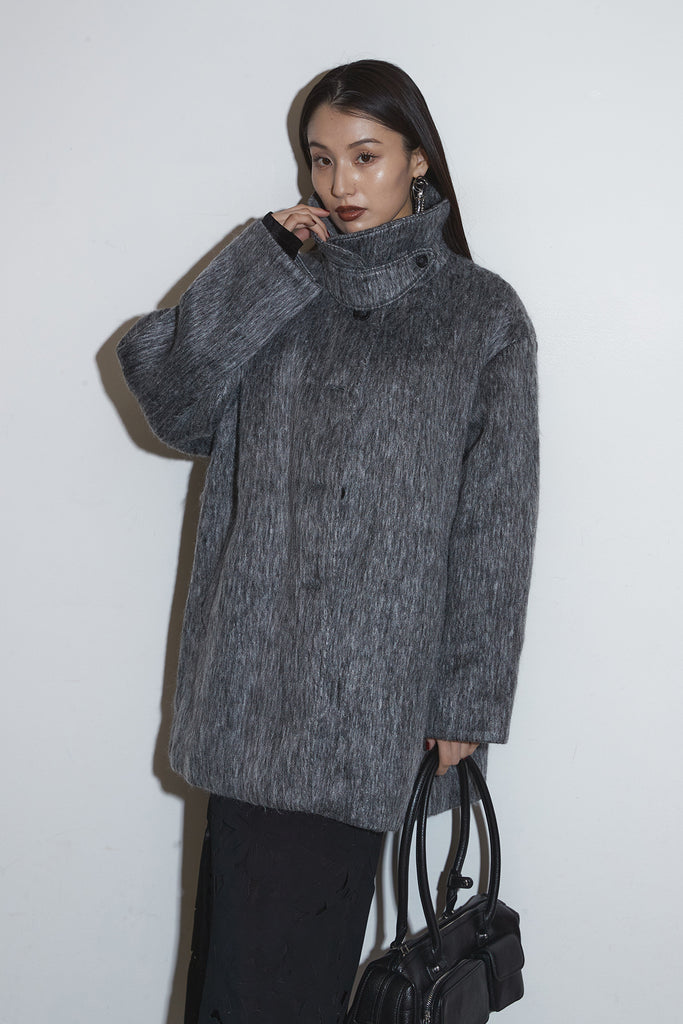 起毛感のあるふんわりとした質感が目を惹くスタンドカラーコート。首まわりまで包み込む高めの襟と、ゆとりのあるシルエットが柔らかなボリュームをつくり、シンプルながら存在感のある一枚に仕上がっています。長めの丈感でさりげなく体を包む、軽やかさと暖かさを両立したアウターです。