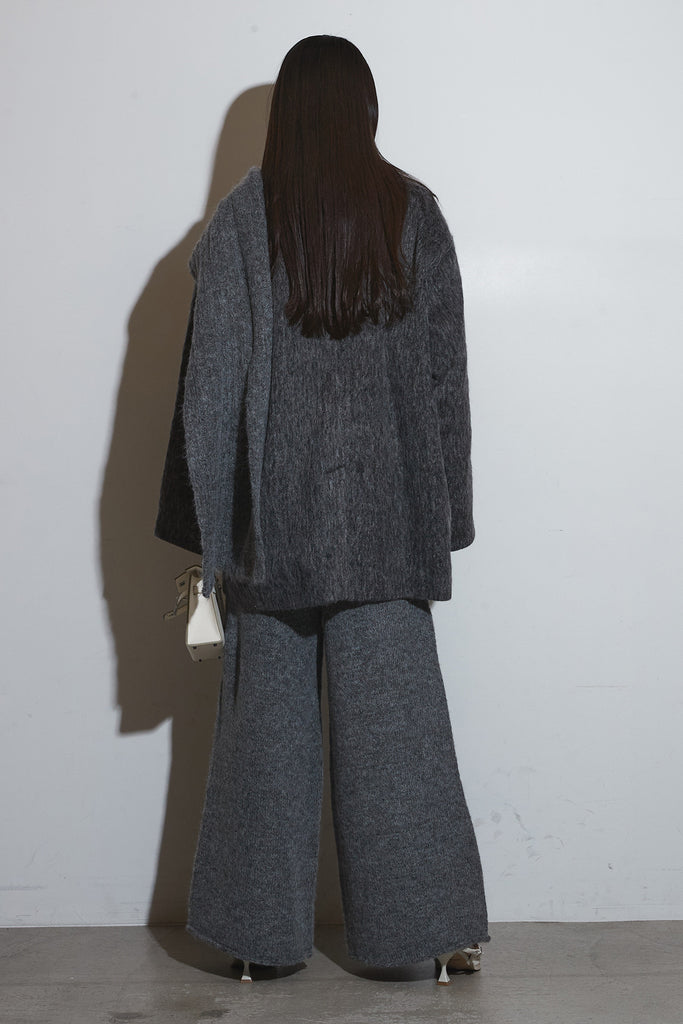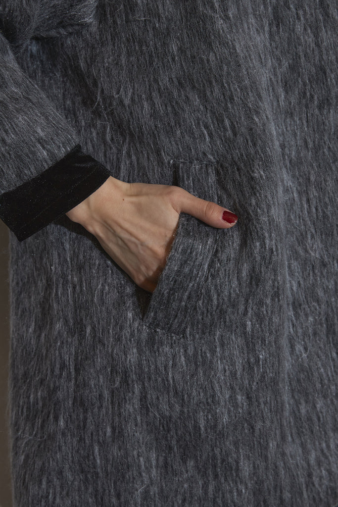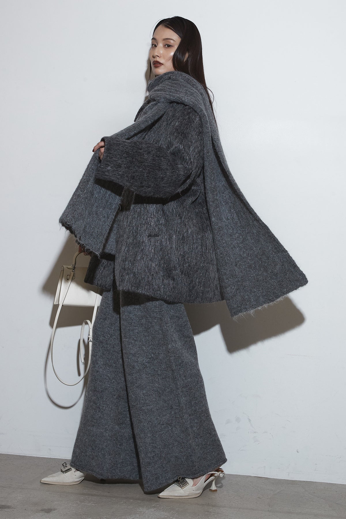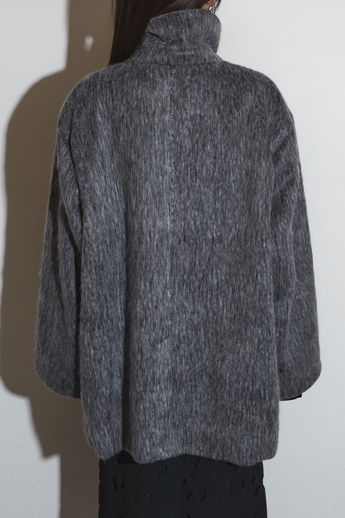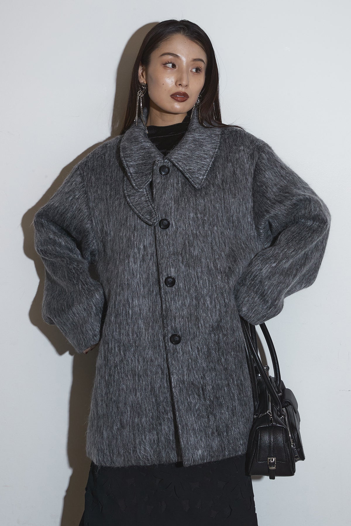 起毛感のあるふんわりとした質感が目を惹くスタンドカラーコート。首まわりまで包み込む高めの襟と、ゆとりのあるシルエットが柔らかなボリュームをつくり、シンプルながら存在感のある一枚に仕上がっています。長めの丈感でさりげなく体を包む、軽やかさと暖かさを両立したアウターです。